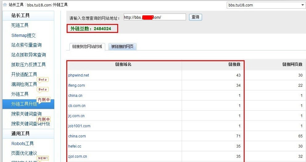 升级版外链工具,除了可以查询自己网站功能外,还可以查询其他网站的数据。