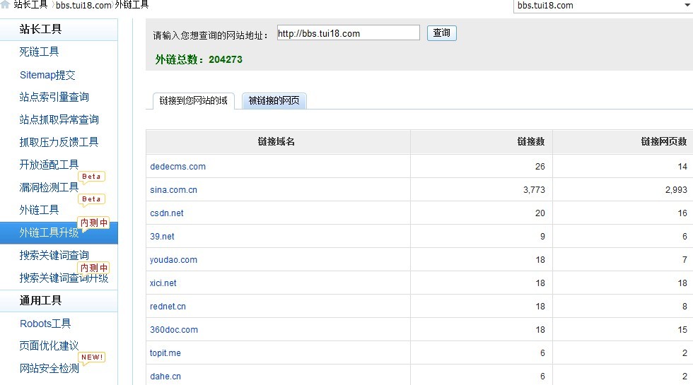 自从雅虎外链工具失效以后,站长们对如何查询外链这块非常饥渴,一方面想了解自己的网站外链数据到底是否有效,另一方面也方便分析竞争对手在哪里发过外链等等,在前几天百度站长平台就推出了只能查自己网站外链的工具,在百度站长平台的工具中,测试版的外链数据站长们反映外链数据不准确,数据少,只能查自己的外链等问题,百度站长平台外链查询工具又继续升级,推一把论坛有幸被邀请参加百度站长平台的外链查询工具新版内测。简单说说体会: