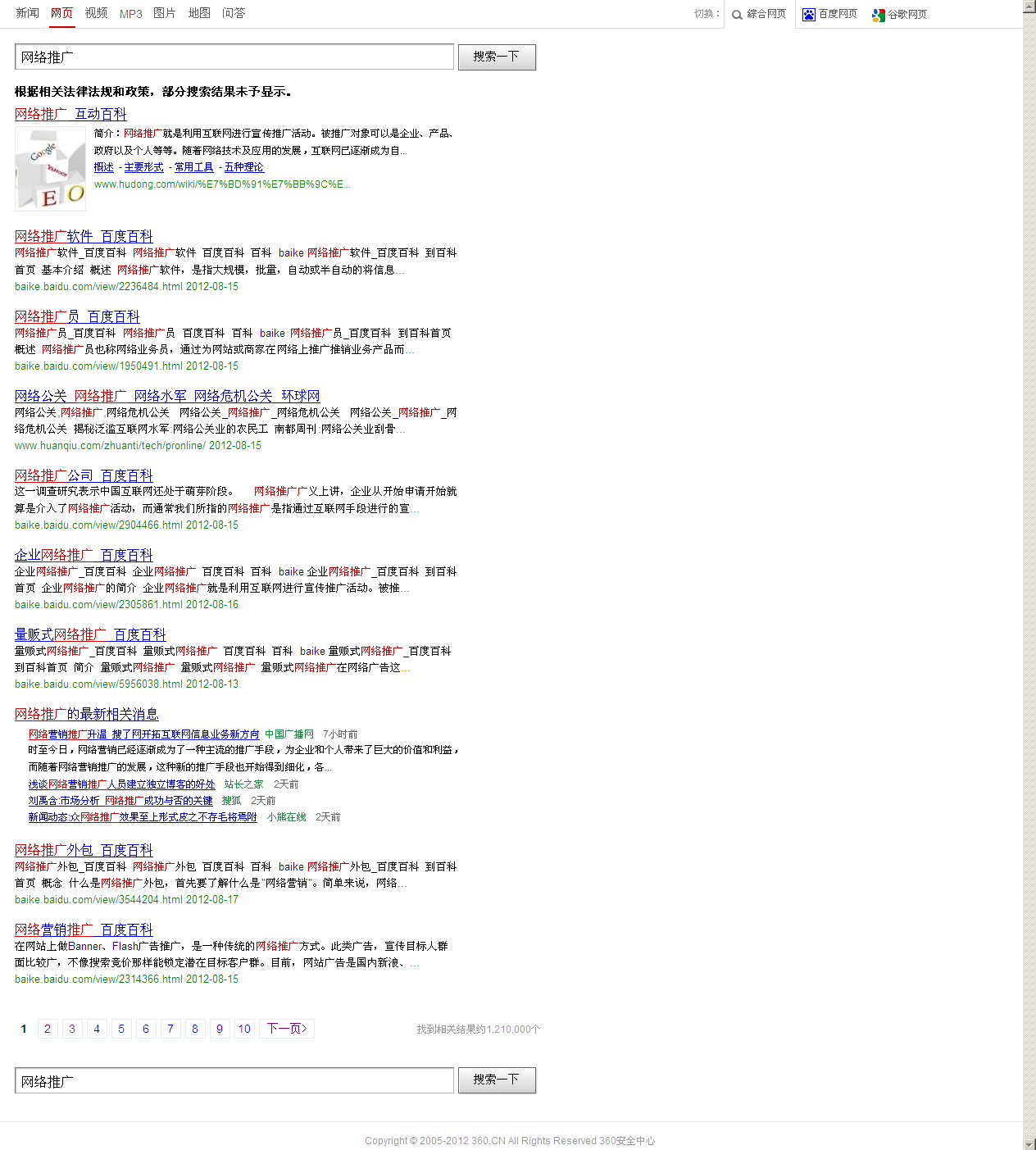下图为在360搜索结果页的排名情况,显示的大部分是百度百科,甚至第二页第三页也是,结果明显落后与百度,谷歌。
