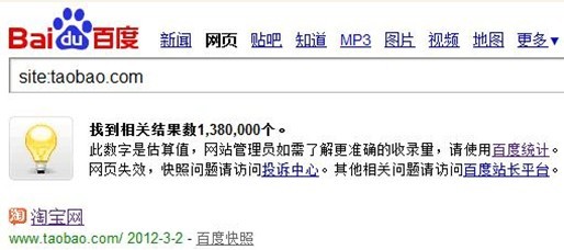 使用site:指令或直接搜索URL都可以检查URL是否被索引,能查到URL却不一定说明页面被抓取了。经常有人问搜索结果中URL没有说明文字,只有URL,标题也和页面真正标题不一样是什么情况,原因之一就是页面被索引了,但没有被抓取。如图所示淘宝在百度的收录就是典型。