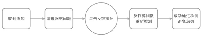功能具体流程如下图所示:站长在收到带有反馈功能的消息后,按照消息提示对网站问题进行整改,然后点击反馈按钮,申请反作弊团队对网站进行重新检测,确实完成整改的网站,可免受惩罚。