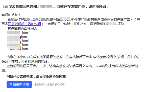 【重要】反馈消息将由百度反作弊团队指定发出,消息内容下方的蓝色反馈按钮仅可点击一次,请站长朋友一定珍惜这次机会,确保站点整体整改后再进行提交。