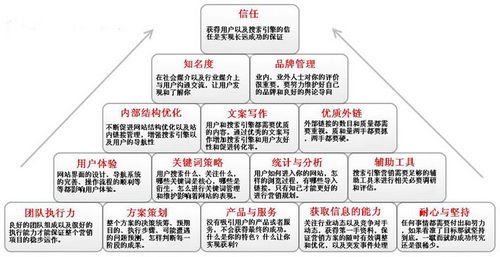 SEO的入门其实很简单,也至于很多人在看了网络上的一些知识就觉得自己会SEO了。事实上,一个成功的SEO项目并不是做垃圾站那样简单,本质是一套系统的过程,在操作过程中又渗透着各种细节处理。(垃圾站的处理过程其实不系统,没有真正SEO项目要考虑和注意的繁杂,所以能做垃圾站成功的人不一定能做好一个真正的SEO项目。)如何在这个系统过程中做好每一个步骤需要的不仅仅的SEO能力,还需要眼光和决策能力以及细节处理能力。下面这张SEO金字塔图简单介绍了这样一个系统的处理过程。