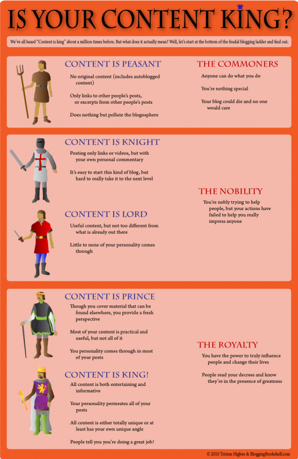 内容为王,这是一个老生常谈的话题,在社会化网络时代,内容策略的地位还是非常重要的,那么什么样的内容才算是王呢?你的内容是农夫还是国王,上面的信息图非常有趣,对照下你的内容,看看自己处在什么等级上。