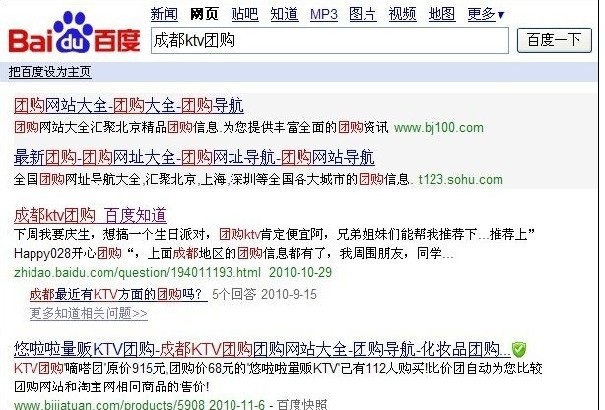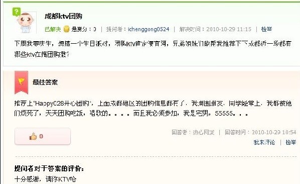 先给大伙举个例子吧,大伙在百度搜索框中输入“成都ktv团购”,排在百度第一是那个页面呢,看到了吧?除了前面灰色底的收费推广之外,就是百度知道的页面,先是A君问“成都ktv团购都有哪些?成都ktv团购是不是很贵啊,谁能给我推荐几个成都ktv团购啊,老婆过几天就要生日了,想叫上朋友们一块去好点的ktv庆祝一下,谁能告诉我啊,谢谢了。”,然后B君做了详细的回答,并在参考资料加上网站首页链接。给力吧,这个回复被设为最佳答案没超过5个钟头,便成为了“成都ktv团购”关键词免费推广排名第一的页面。