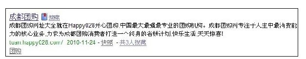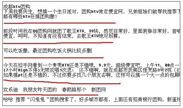 1、提问的标题。过于热门的词,做百度推广排名甚微,比如说,刚开始我瞄准“成都团购”,做了好几次百度知道推广,答案也挺细,答案也挺多的,顶贴也给力,但搜索百度前10页都找不到,后来意识到这个词过热,组合其他长尾词,效果马上来了。还有另外一点,问题的标题一般与推广关键词匹配的精确度越高越好,最好可以直接使用一些长尾词当做标题来提问,比如说”成都ktv团购“,”成都美食团购“等类似长尾关键词作为标题,排名比一些有很多废话的问题排名是要靠前的!