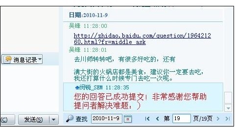 4、回答答案单独小窗口发给团队队员。每个帮派都有自己独有的帮规,事先制定好规则大家好办事,比如说,给小窗口的时候问题链接在上面,回答问题的在下面,最好分开2次发,有次,我链接和答案作为一条发给其中一个朋友,他估计忙晕了,一股脑把链接也发上去了,让我苦笑不得,这样会影响美观,感觉怪怪的,以后我就分成2次发了。现在我们QQ群都做了统一规定,非常默契了,一开始还“帮忙,谢谢”之类,最后都省去了,大伙都心照不宣,非常默契,一看如此格式,10个答案一般不超过20秒大伙都能发上去了。在这里提醒下,一定要单独小窗口阿,因为大伙都挺忙的,在群里面发答案大伙不太容易注意,以为你在上面说话呢,再说你在群里面发,谁知道那个答案是我回答,那个答案是你回答呢,说不定回答还重复了呢,单独发大伙肯定都会帮你回答的。