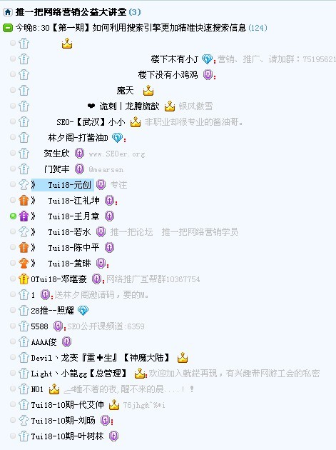 为了回报广大的会员朋友们,推一把网络营销学院与多玩YY正式达成合作,开通了“推一把网络营销公益大讲堂”频道,此频道将会在每周举行1~3期公益讲座,为大家普及网络营销、网络推广、网站运营、SEO等专业知识。