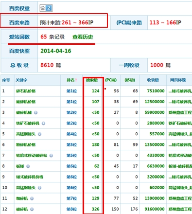 二是每个关键词搜索量要高,破碎机的网站有排名的词平均搜索量在100左右,这样工具评估后,会给出一个参考流量,再根据参考流量评估权重值。所以,如果想要提升百度权重,增加SEO流量,必须要让SEO人员使更多的关键词获得排名。