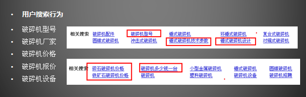 如图,通过百度相关搜索了解到,用户不仅会搜索破碎机,还会搜索破碎机型号,参数,价格等